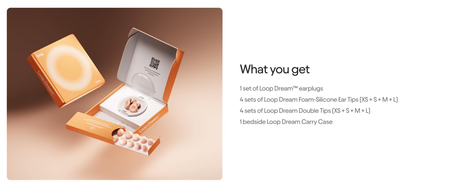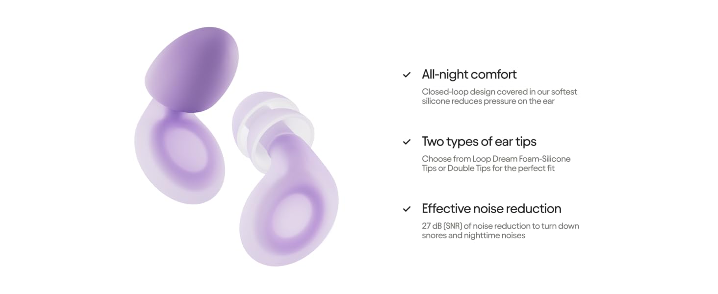 Loop Dream is designed fornoise reduction during sleep, travel, or quiet relaxation. It blocks disruptive sounds (e.g., snoring, traffic, airport noise) while preserving awareness of important cues (e.g., alarms, a baby’s cry) for safe, restful downtime.
