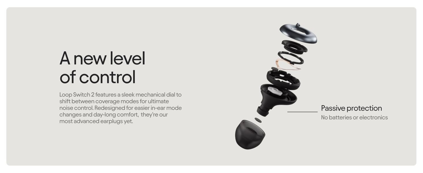 Β Loop Switch 2 has been improved for added comfort, better hearing protection and a sleeker look. The best thing? Itβs fully manual, so no batteries or electronics are needed β just turn the mechanical dial for total sound control.Β